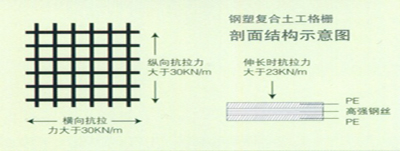 鋼塑復合土工格柵以高強鋼絲(或其他纖維),經特殊處理,與聚乙烯(PE),并添加其他助劑,通過擠出使之成為復合型高強抗拉條帶,且表面有粗糙壓紋,則為高強度加筋土工帶。由此單帶,經縱、橫按一定間距編制或夾合排列,采用特殊強化粘接的熔焊技術焊接其交接點而成型,則為加筋土工格柵。